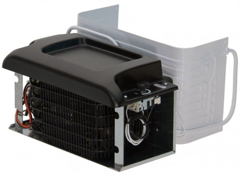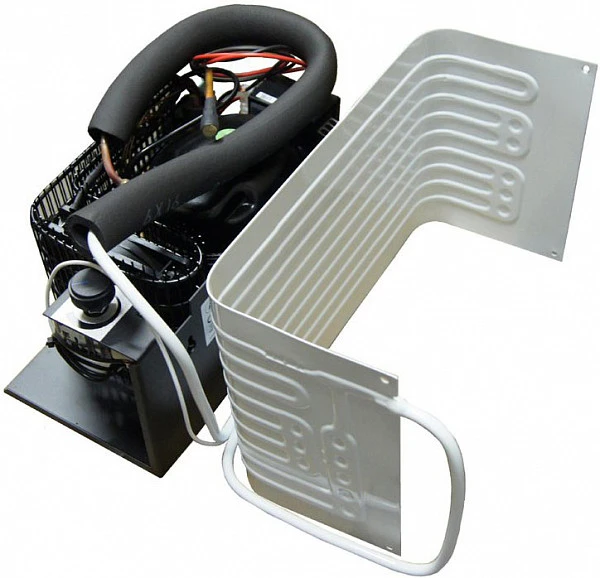 Данное охлаждающее устройство оборудовано испарителем, герметичным компрессором, вентилятором, конденсатором, датчиком опрокидывания, блоком регулирования, термостатом и терморегулятором. Данный агрегат можно легко и быстро превратить в качественный холодильник для автомобилей с помощью его установки в термический ящик, который находится к кабине машины. Представленный холодильный агрегат обладает весом всего в 8 кг и функционирует при наличии напряжения от 12 до 24В. Мощность работы составляет 60Вт, а хладагентом является R-134A. Это оборудование оснащено функцией, которая обеспечивает безопасное защитное отключение и осуществляет, поддержу установленной температуры в автоматическом режиме. При этом данный холодильный агрегат оснащен специальной системой от опрокидывания кабины и системой принудительного охлаждения Устройство может функционировать с температурой от -2 до +10 градусов.