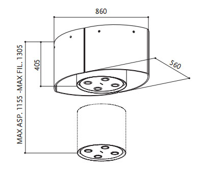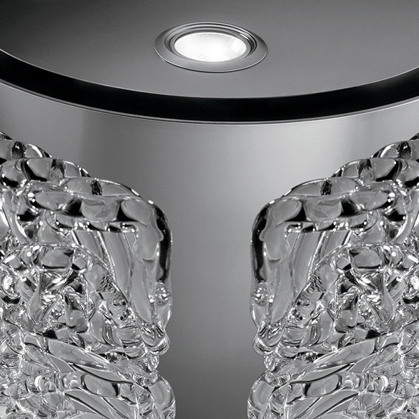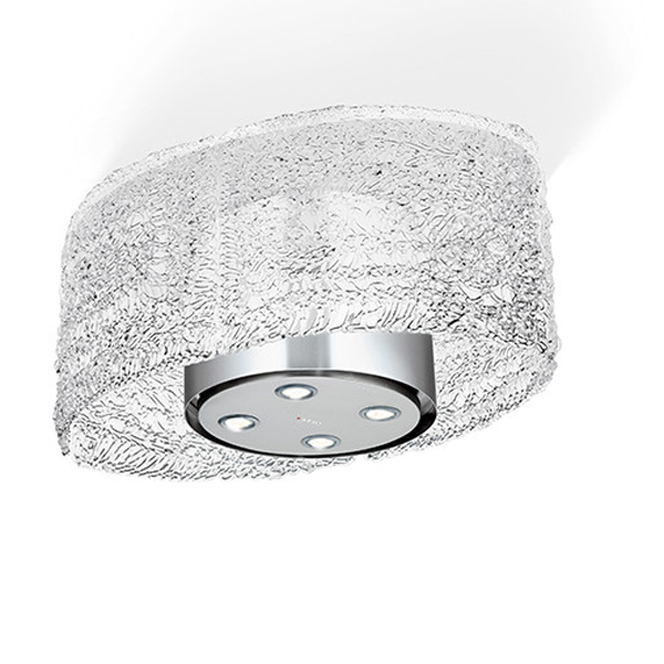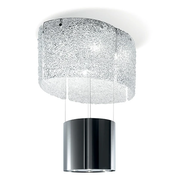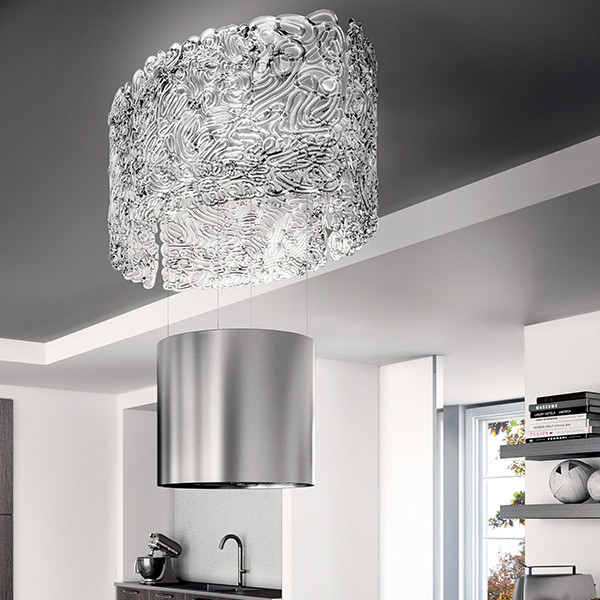 Четыре изогнутых стеклянных панели формируют корпус люстры, которая в свою очередь ярко отражает свет, а внутри этой люстры расположена вытяжка.