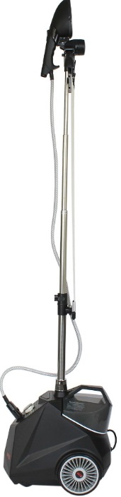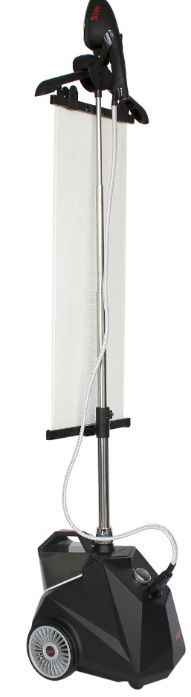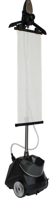 На стойку устанавливается регулируемая вешалка с держателем парового утюжка, удерживающий зажим и ткань для вертикального глажения.