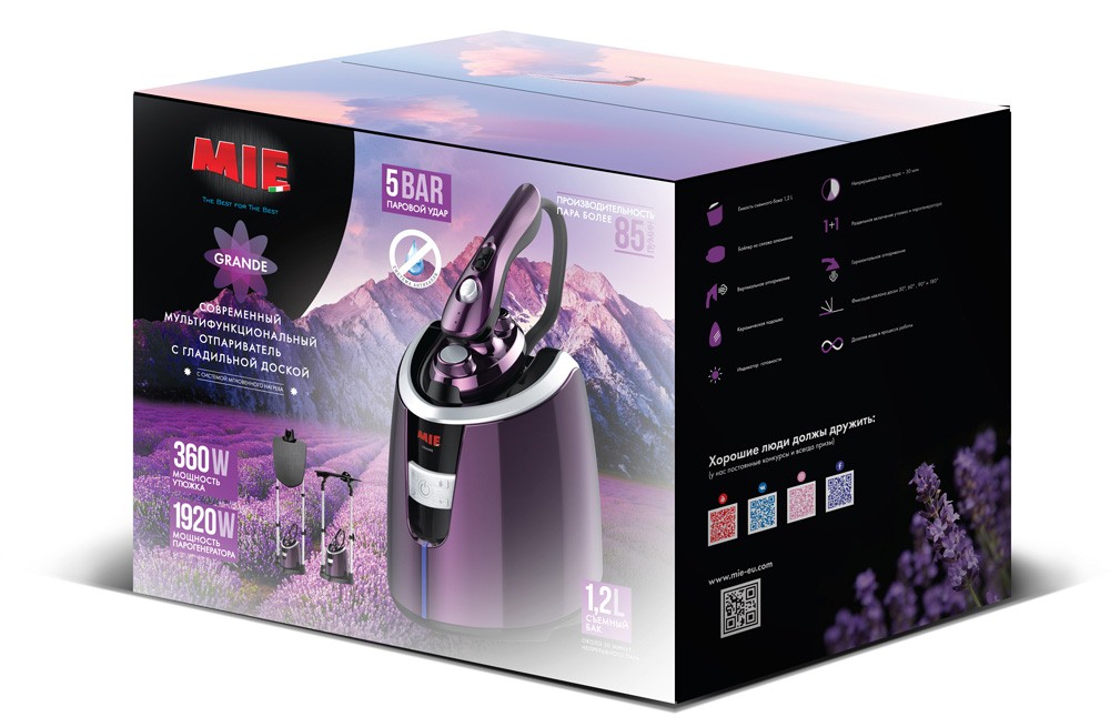 Отпариватель нового поколения Mie Grande – это мощный агрегат, который создан для максимально быстрого решения самых сложных задач в глажении белья. С его помощью можно разгладить пересушенное изделие из плотной ткани, удалить заломы с одежды, дезинфицировать белье паром, а также придавать ношенным вещам свежий вид. Двойная нагревательная система, наличие мультифункциональной доски, усовершенствованный паровой утюжок с вращающейся головкой, дополнительные аксессуары – все это позволяет модели Mie Grande добиваться профессионального результата в отпаривании.