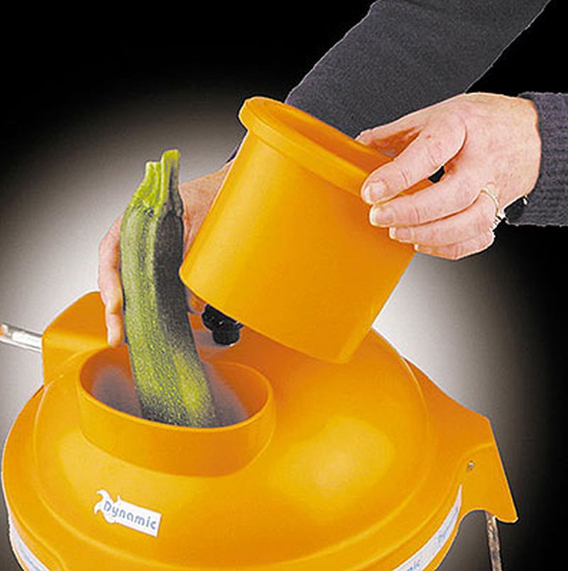 Овощи и фрукты помещаются внутрь овощерезки и слегка придавливаются специальным толкателем, после чего оператор начинает вращать боковую ручку.