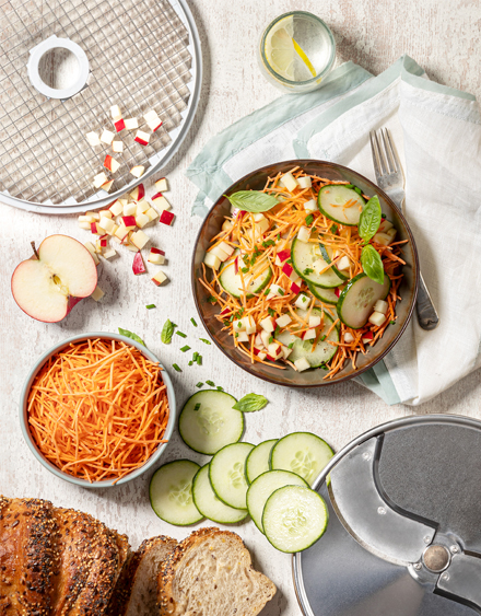 Два бункера для адаптации ко всем типам овощей: широкий бункер площадью 217 см2 для объемных овощей, таких как капуста, сельдерей, и цилиндрический бункер Ø 60,5 мм для длинных и нежных овощей (кабачки, огурцы).