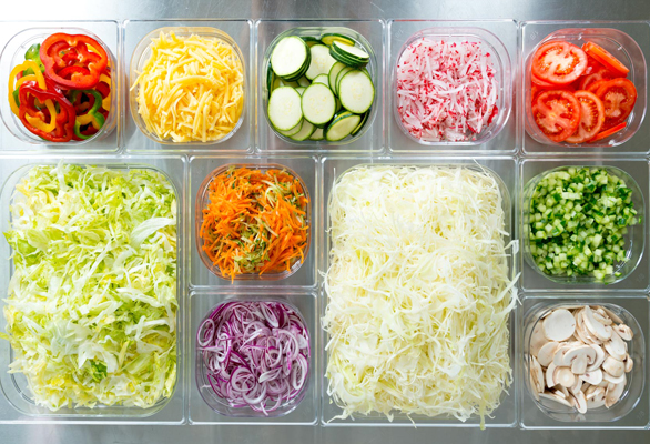 Продукты (овощи, фрукты, сыры, вареное мясо, помидоры) режутся аккуратно.