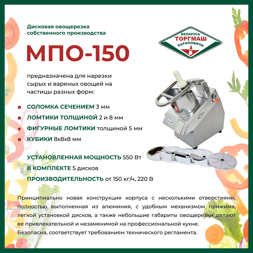 Овощерезка Торгмаш МПО-150 предназначена для нарезки сырых вареных овощей на частицы разных форм на предприятиях общественного питания и торговли.