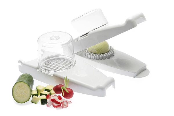2 прозрачных контейнера, 1 верхняя секция со встроенным измельчителем для маленьких кубиков или маленькой соломки, 1 верхняя секция со встроенным измельчителем для больших кубиков или большой соломки, 1 основание
