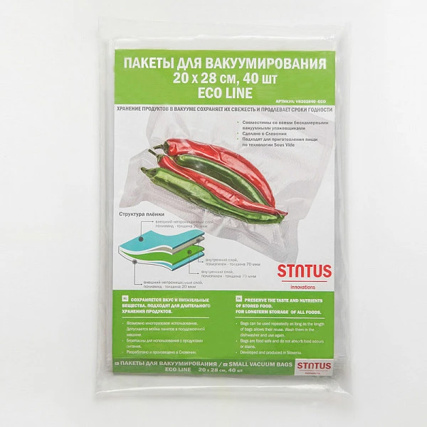 Пакеты для вакуумной упаковки Status VB 202840-ECO предназначены для вакуумирования продуктов в домашних условиях. Если вы хотите сохранить качество ваших продуктов, поместите их в вакуумные пакеты и рулоны от STATUS (Словения). Толщина пленки 90 мкм обеспечивает непроницаемость для кислорода.