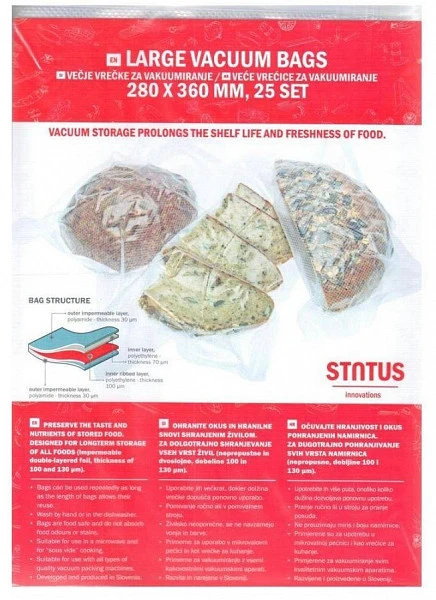 Вакуумные пакеты STATUS можно мыть даже в посудомоечной машине и использовать несколько раз. Просто будьте осторожны с теми пакетами, которые содержали сырое мясо или рыбу. Вы можете принять дополнительные меры предосторожности, положив мясо в обычный пакет, прежде чем хранить его в вакуумной упаковке, чтобы сохранить упаковку в чистоте. Вы можете использовать один и тот же пакет сколько угодно раз.