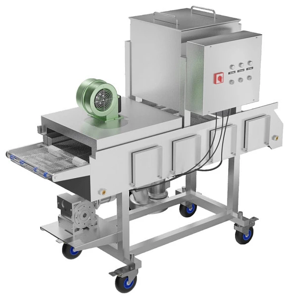 Отдельное управление сетчатым транспортёром, узлом обдува продукта, а также подачей панировки.