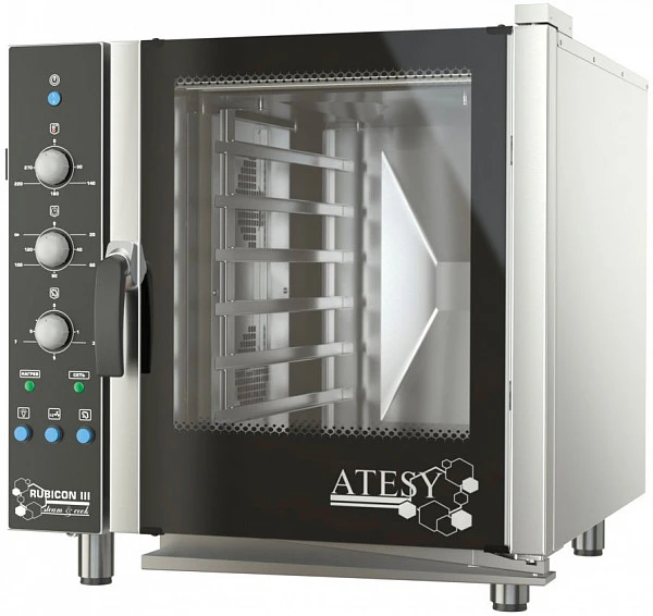 Пароконвектомат Атеси Рубикон АПК-6-1.1.-03 представляет собой универсальную печь, которая использует режимы сочетания пара и принудительной конвекции для приготовления пищи.