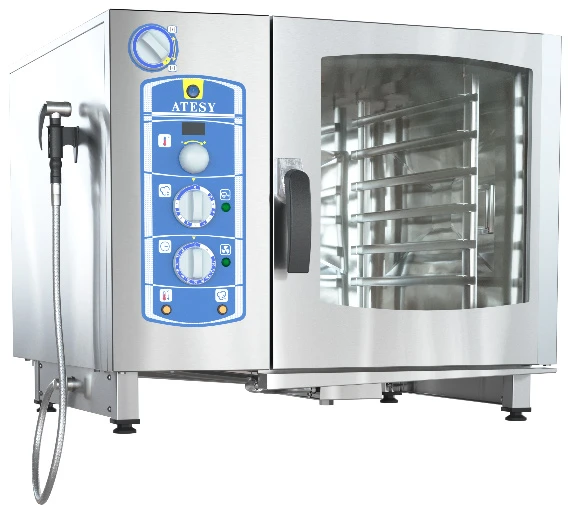 Пароконвектомат Атеси Рубикон АПК-6-1/1-И используется на предприятиях общественного питания и торговли для приготовления широкого спектра блюд как на пару, так и при помощи сухого нагрева. Представляет собой универсальную печь, которая использует режимы сочетания пара и принудительной конвекции для приготовления пищи.
