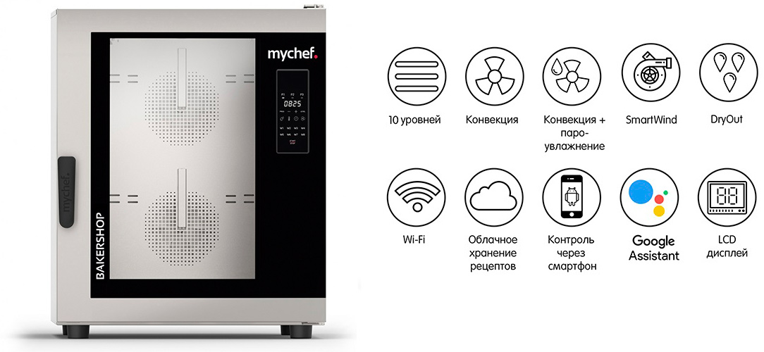 • Облачное храненение рецептов и параметров приготовления на базе сайта Mychef с возможностью подключения нескольких печей.