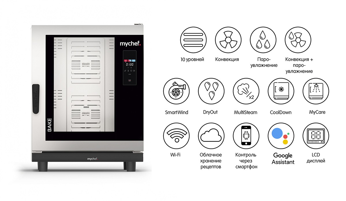 Пароконвектомат Distform Mychef Cook UP 10 GN 1/1 right opening позволяет тушить, запекать, жарить, готовить на пару, по технологи Sous vide, сушить, размораживать, коптить на предприятиях общественного питания и торговли.