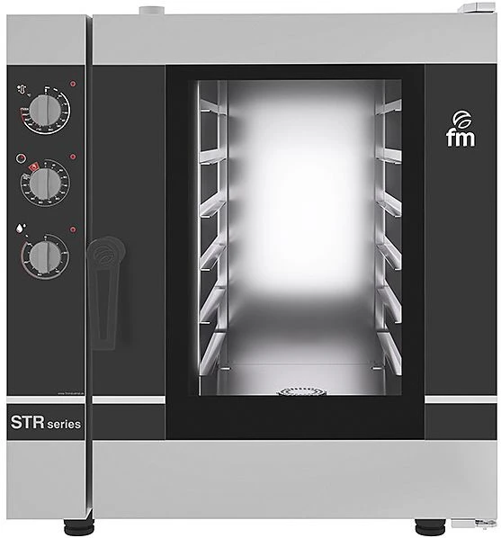 Пароконвектомат FM STR 106 M предназначен для выпекания различных кондитерских и хлебобулочных изделий, замороженных или предварительно выдержанных в расстоечном шкафу заготовок из теста на предприятиях пищевой промышленности, общественного питания и торговли. Модель оснащена универсальными направляющими, которые позволяют разместить противни и листы для выпечки. Корпус и камера выполнены из нержавеющей стали.
