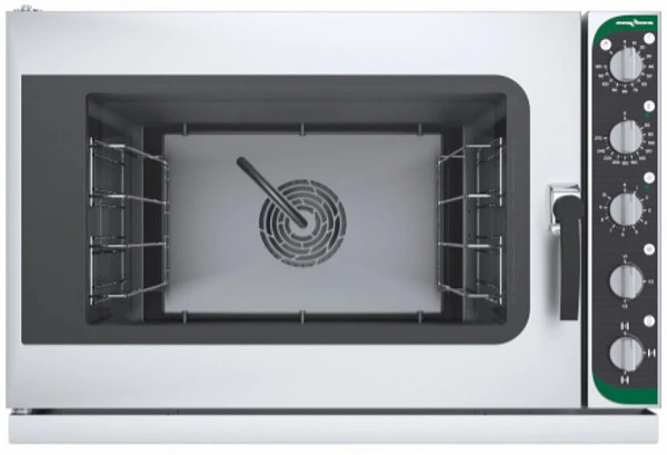 Пароконвектомат состоит из жарочной камеры, установленной в корпусе, дверей и панели управления. На задней стенке камеры пароконвектомата установлены электродвигатели и трубчатые электронагреватели, один электродвигатель и один ТЭН. Для достижения экономичного расхода электроэнергии и безопасности, жарочная камера изолированная слоем теплоизоляции.