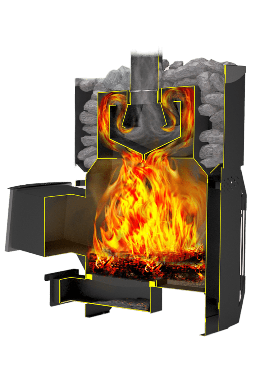 Кожух-конвектор экранирует жесткое инфракрасное излучение, исходящее от раскаленных стенок топки, что создает «мягкое» тепло в парилке.