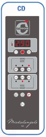 ВЕРСИЯ CD: Система управления с помощью электронной платы; возможность установки температуры в камере и мощности двух блоков нагревательных элементов (верха и пода) по отдельности: OFF – выключено, MIN – 33 % или MAX – 100 %; звуковой сигнал об окончании приготовления; программируемое включение печи с обратным отсчетом до 99 часов.
