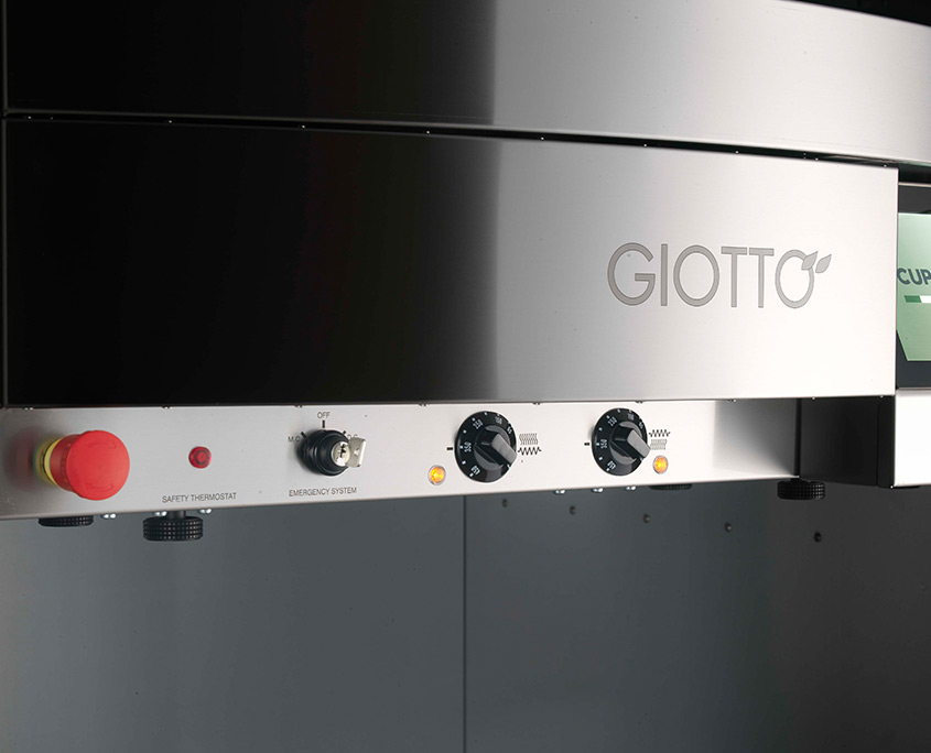 Максимальная точность и контроль производительности, скорость и равномерность приготовления, невероятная практичность и эргономичность – вот плюсы обновленной электропечи GIOTTO с вращающимся подом, переосмысленной в цифровой версии. Благодаря новой системе управления с сенсорным экраном стало возможным: регулировать независимым образом и с большой точностью температуру в камере и на поде, мощность двух групп тэнов (на своде и на поде) от 0% до 100%, скорость и направление вращения пода, а также уровень мощности вытяжки; программировать приготовление; программировать включение на неделю; оптимизировать расход энергии. На этапе транспортировки и установки можно поворачивать печь на снабженной колесиками опоре, а благодаря максимальным габаритам, равным 79 см в ширину и 196 см в высоту, возможно пронести устройство через стандартную дверь.