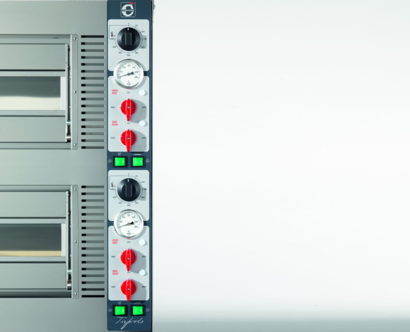 Электромеханическая система управления с возможностью установки температуры в камере и мощности двух блоков нагревательных элементов (верха и пода) по отдельности на минимальную или максимальную мощность.