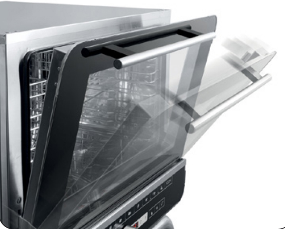 Дверца закрытия с двойным закаленным термоотражающим стеклом с воздушной прослойкой для наименьшего излучения тепла на оператора и повышенной эффективности.