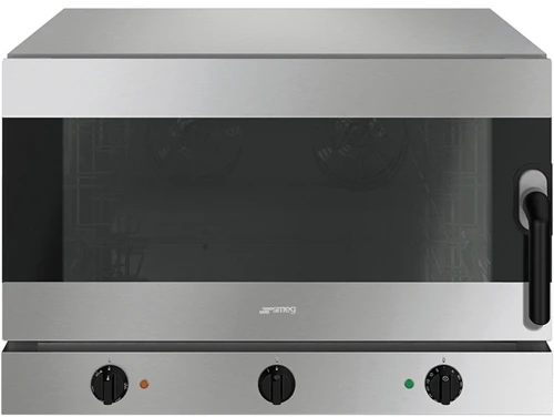 Конвекционная печь Smeg ALFA425H из нержавеющей стали с конвекцией, пароувлажнением и боковым открыванием дверцы предназначена для выпечки хлебобулочных и кондитерских изделий и приготовления различных блюд на предприятиях пищевой промышленности, общественного питания и торговли.