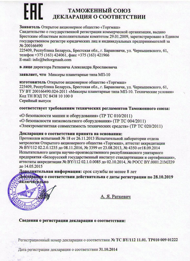 Планетарный миксер Торгмаш МП-10 предназначен для замеса теста различной консистенции в цехах выпечки и изготовления хлеба, пиццы, печенья, пирожных, тортов; перемешивания паштетов, пюре, майонеза, соусов и других пищевых смесей; взбивания сливок, мороженого, кремов; перемешивания фарша и т. д. на предприятиях пищевой промышленности и других организациях по производству продуктов питания.