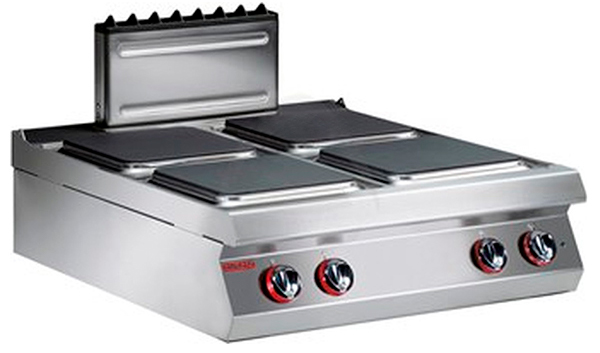 Плита с 4 квадратными конфорками размером 295*295 мм (4 кВт) из полированного чугуна, с задней стенкой, с воздуховодами, без духового шкафа относится к серии Мedium-duty к модульной линии Alpha 900.