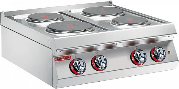 Плита электрическая с 4 круглыми конфорками диаметром 2*220 мм и 2*180 мм (2,6кВт и 2 кВт) из полированного чугуна без духового шкафа относится к серии Мedium-duty к модульной линии Gamma.