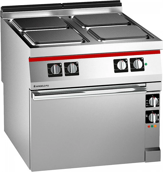 Плита электрическая с 4 квадратными конфорками размером 295*295 мм (4 кВт) из полированного чугуна с задней стенкой с воздуховодами и духовым шкафом относится к серии Мedium-duty к модульной линии Icon 9000.