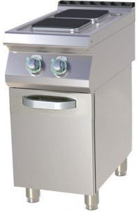 • Плита электрическая напольная, на закрытом стенде с распашной правой дверью, оснащена 2 квадратными чугунными конфорками.