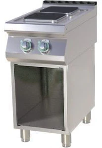 • Плита электрическая напольная, на полузакрытом стенде (открытом со стороны оператора) оснащена 2 квадратными чугунными конфорками.