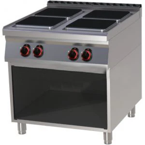 • Плита электрическая напольная, на полузакрытом стенде без дверей (открытом со стороны оператора) оснащена 4 квадратными чугунными конфорками.