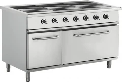Конфорки образуют ровную поверхность; 6 чугунных разборных конфорок, 285х415 мм, мощность 2,5 кВт - 3 шт., 3,0 кВт -3 шт.