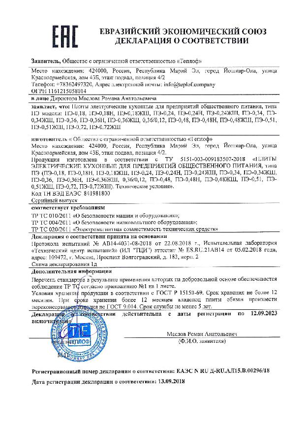 Плита электрическая Теплоф ПЭ-0,48 (Э) предназначена для тепловой обработки пищевых продуктов (варка, жарка, разогрев, в функциональных и других емкостях) на предприятиях общественного питания.