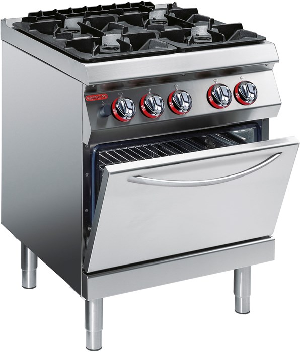 Плита газовая открытая с 4 конфорками диаметром 3*110мм (по 6 кВт) с "двойной короной" и 1*80 мм (4 кВт) с однорядным пламенем с газовым духовым шкафом -функциональный элемент линии Gamma.