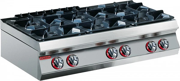 Плита газовая открытая с 6 конфорками диаметром 4*110 мм (по 6кВт) с пламенем типа "двойная корона" и 2*80 мм (по 4 кВт) с однорядным пламенем без духового шкафа - функциональный элемент линии Gamma.