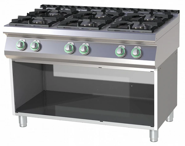 • 6 чугунных открытых конфоркок мощностью: 2х3500Вт (фронтальная правая и задняя посередине) и 4х6000Вт