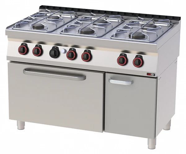 • Плита газовая напольная с газовым статическим духовым шкафом (2/3 модуля) и закрытым стендом с 1 распашной дверцей (1/3 модуля) оснащена 6 чугунными открытыми конфорками мощностью: 2х3500Вт (крайние левые) и 4х6000Вт, контролем пламени.