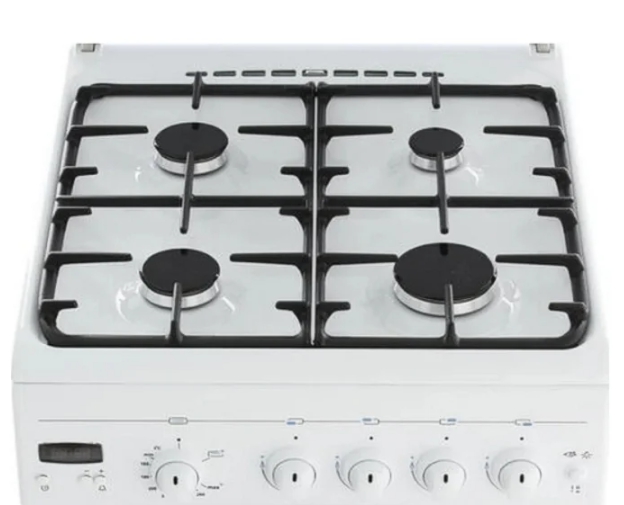 Преимуществом модели, оборудованной 4 конфорками и 52-литровой духовкой, является наличие дисплея, часов и электронного таймера. Управление плитой осуществляется с помощью практичных поворотных переключателей. Для размещения посуды используются чугунные решетки. Особого внимания заслуживает духовка, оборудованная грилем, вертелом и газ-контролем.