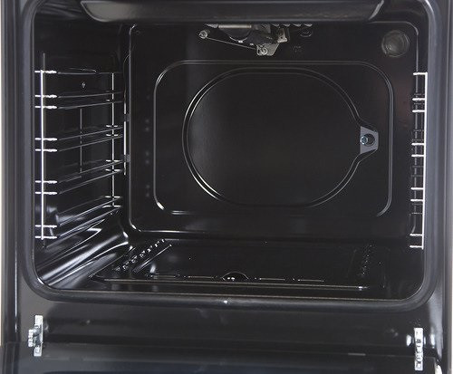Плита с черным металлическим корпусом оборудована четырьмя газовыми конфорками и вместительной духовкой с объемом 52 литра. Конфорки размещены на варочной поверхности из закаленного стекла и снабжены съемными решетками-подставками, выполненными из чугуна. Временно убрав чугунные решетки с панели конфорок, можно без особых усилий навести порядок на идеально гладкой панели.