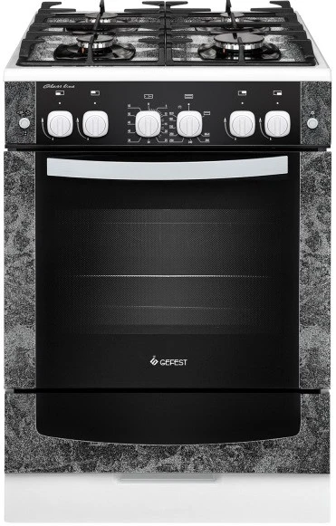 Плита газовая Gefest ПГ 6500-02 0113 газовая плита шириной 60 см, современный дизайн с выступающими элементами в белом цвете. Основная цветовая гамма - рисунок, имитирующий мрамор, сам фасад-стеклянный.