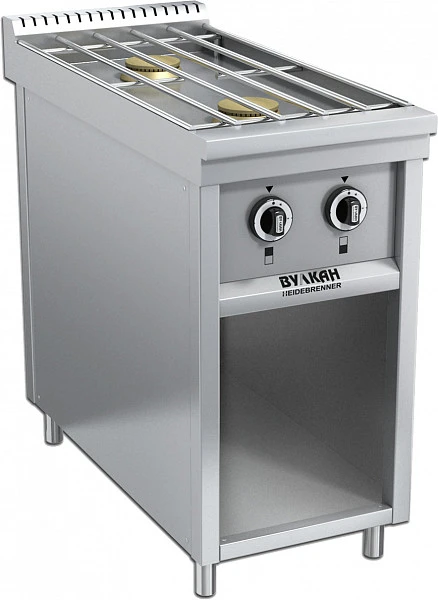 Компактная газовая плита с 2-мя мощными горелками по 6 кВт и съёмной решеткой из нержавеющей стали, позволяющей свободно перемещать посуду по всей ее поверхности. На решетке одновременно размещаются 2 кастрюли объёмом 30 л. В нижней части плиты имеется ниша для хранения кухонного инвентаря. Плита оснащена системой газконтроля и может работать как на природном, так и на сжиженном газе. Корпус изготовлен из высококачественной нержавеющей стали, что значительно облегчает уход за плитой. Герметичная столешница дает возможность производить влажную уборку, исключая попадание жидкости во внутренние полости плиты.