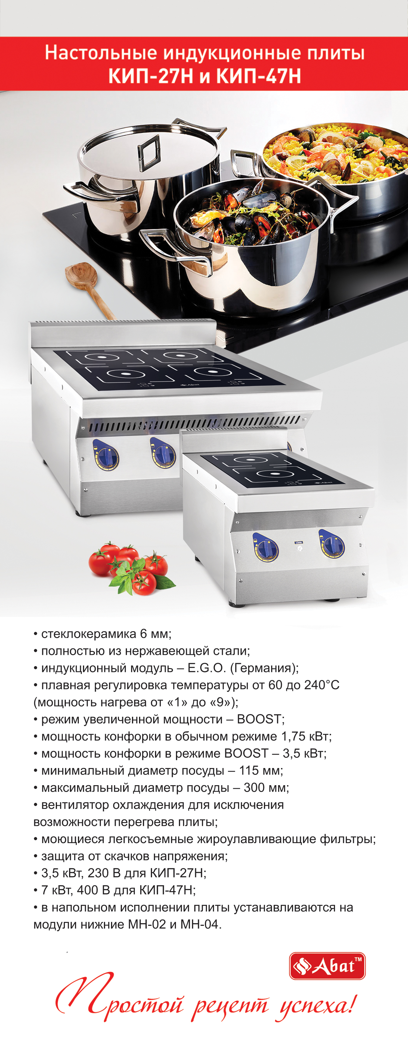 Плита индукционная Abat КИП-27Н предназначена для приготовления первых, вторых и третьих блюд в наплитной посуде. Используемая посуда должна обладать магнитными свойствами (к ней должен притягиваться магнит) и иметь плоское дно. Может использоваться посуда из нержавеющей стали или алюминия с ферромагнитным дном, чугунная посуда.