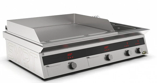 Плита индукционная комбинированная Smart Induction K76-5RRKN (2-х зонный рифленый гриль | 2 конфорки) предназначена для приготовления первых, вторых и третьих блюд в наплитной посуде, а также для непосредственной жарки мясных, рыбных и овощных блюд на предприятиях общественного питания и торговли.