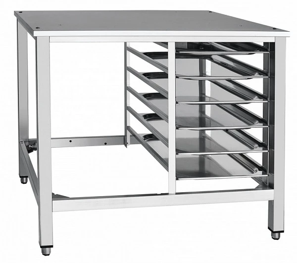Подставка Abat ПК-6МС является вспомогательным оборудованием и предназначена для установки пароконвектомата типа ПКА на столешницу и размещения шести гастроемкостей GN 1/1 на держателях полок.