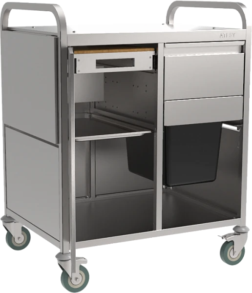 Предусмотрена возможность дополнить базовую комплектацию отдельными опциями: выдвижной разделочной доской с гастроемкостью, ящиком для инвентаря, выдвижной урной;
