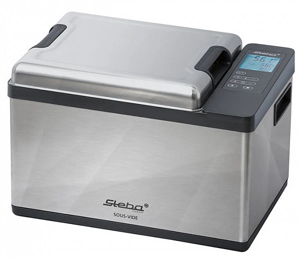 На ярком дисплее с синей подсветкой и индикатором Вы можете выставить рабочую температуру и таймер. Объём чаши из нержавеющей стали составляет 12,5 л. Водяная печь Steba SV 200 PRO (профессиональный sous-vide coocker) позволит приготовить до 50 порций по технологии сувид – приготовление при низкой температуре в вакуумной упаковке.