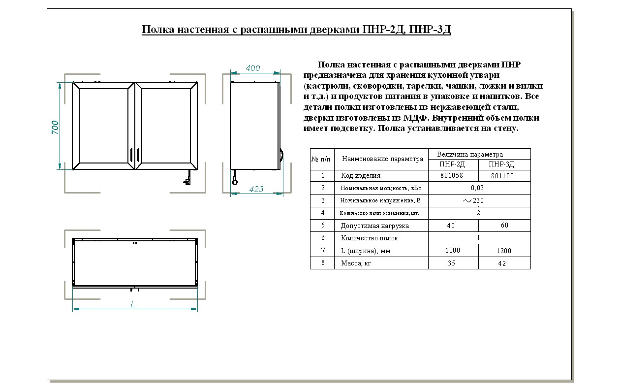 Полка настенная с распашными дверками Abat ПНР предназначена для хранения кухонной утвари (тарелки, чашки, ложки и вилки и т. д.) и продуктов питания в упаковке (крупы, макаронные изделия, приправы и т. д.).