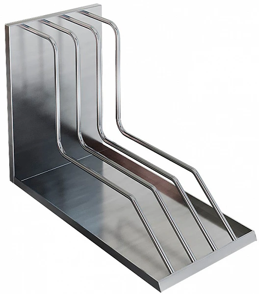 Полка для хранения досок имеет три уровня, каждый из которых выдерживает нагрузку в 20 кг, изготовлены из прутка 6 мм и листа 0,8 мм марки AISI 304, устанавливается с помощью шурупов на стену.