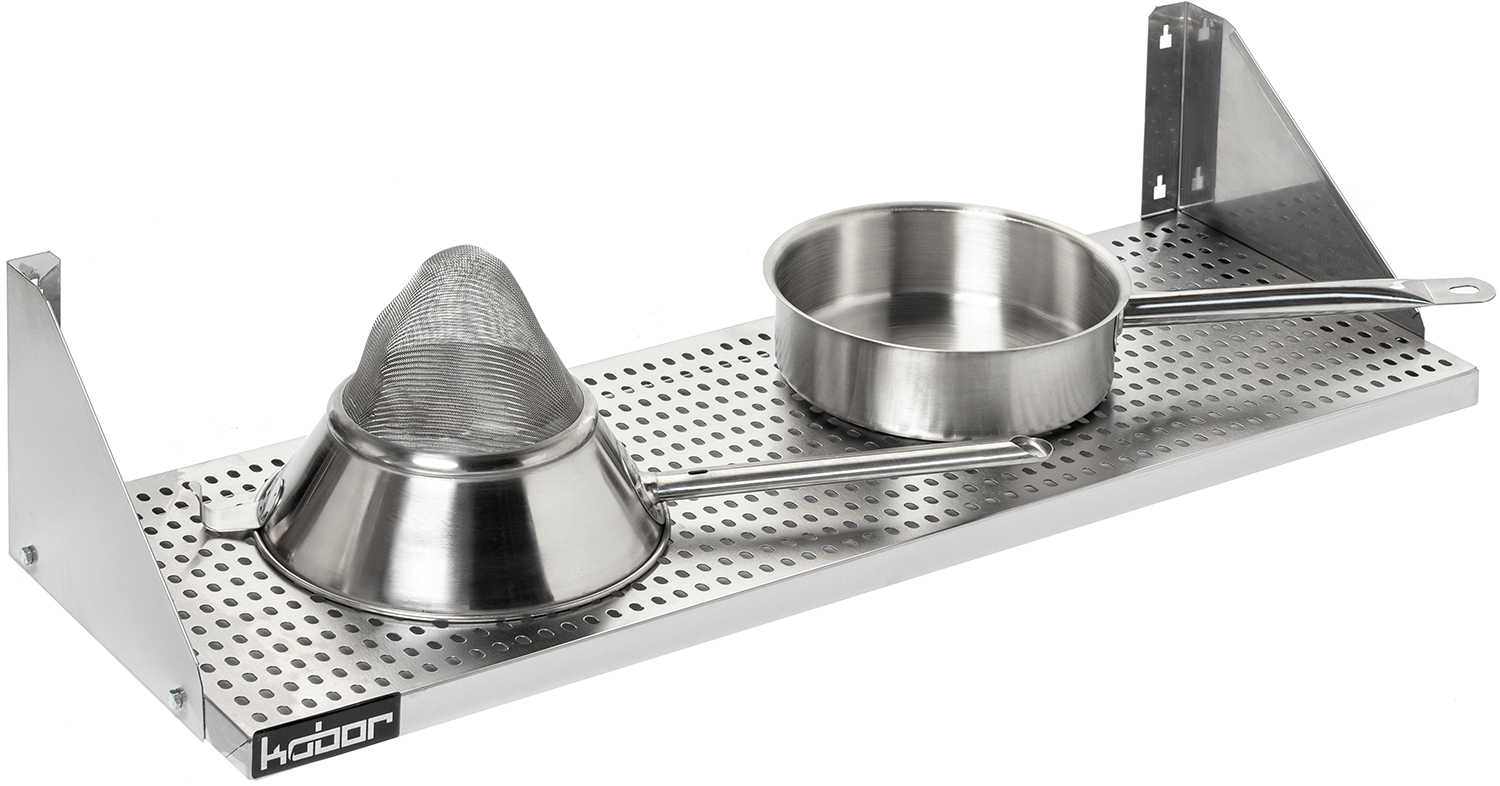 Полка настенная перфорированная Кобор ПР-150/30 предназначена для хранения и временной расстановки посуды и кухонного инвентаря на предприятиях общественного питания, магазинах, заготовительных предприятиях.
