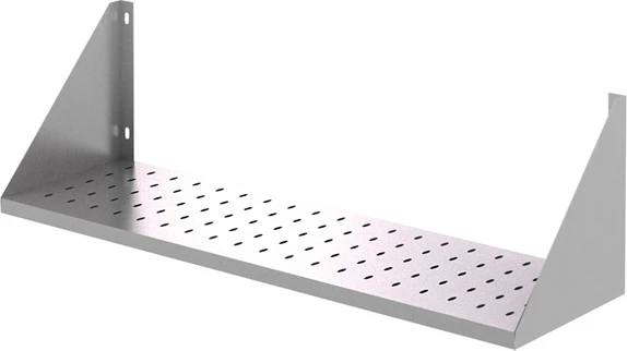 Полка настенная Luxstahl ПНКП 15/3 перфорированная из нержавеющей стали AISI 430 используется для хранения непортящихся продуктов и полуфабрикатов, а также кухонной посуды: сковородок, тарелок, кружек и прочего на предприятиях общественного питания.